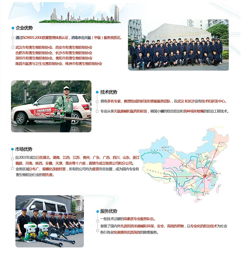 我們堅持“誠信、高效、安全、環(huán)保”的服務宗旨,所用器械均為世界優(yōu)質(zhì)產(chǎn)品,所用藥物均系國家藥檢部門和衛(wèi)生防疫部門批準的安全、低毒的城市衛(wèi)生用藥,并根據(jù)具體作業(yè)環(huán)境和防治對象情況變化,制定具體防制方案,保證優(yōu)越的防治效果和人體安全。